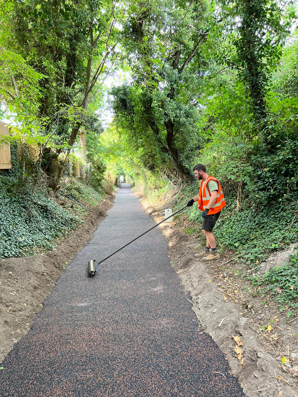 Installed directly on to type 3 aggregate or in some cases directly on to a membrane, the surface is manufactured on site using a cold, one part poured process which can be trafficked within 16 hours. Trailflex is a one part cold poured system. We advise you to consult a ground engineer to ascertain the type of the ground you are working with prior to installation. Membrane may be required beneath the type 3 in the case of heavy clay in the existing ground.